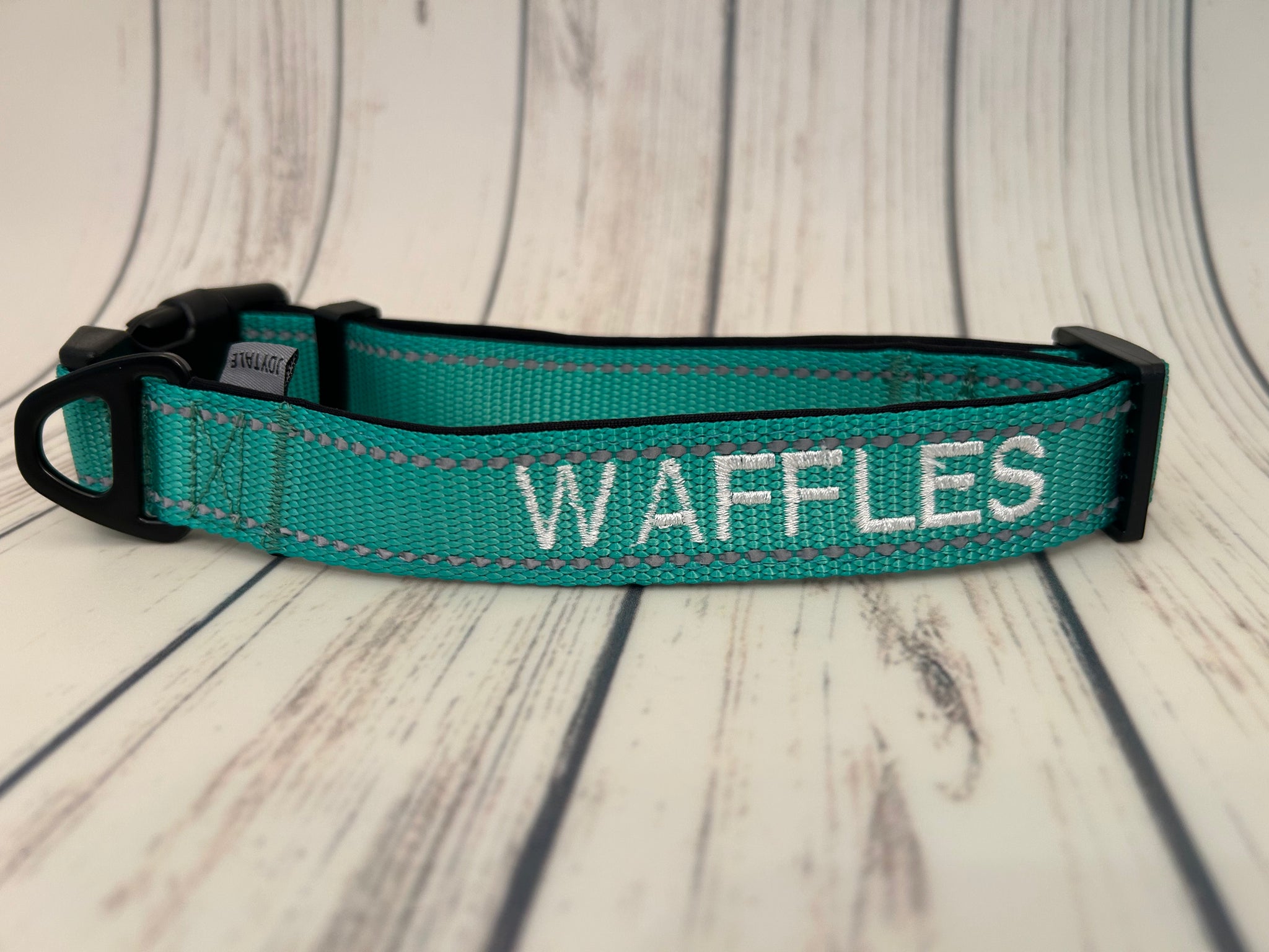Each collar is embroidered with your dog’s name and phone number, because style should always come with peace of mind. Soft neoprene padding helps prevent chafing, while durable materials stand up to everyday adventures.